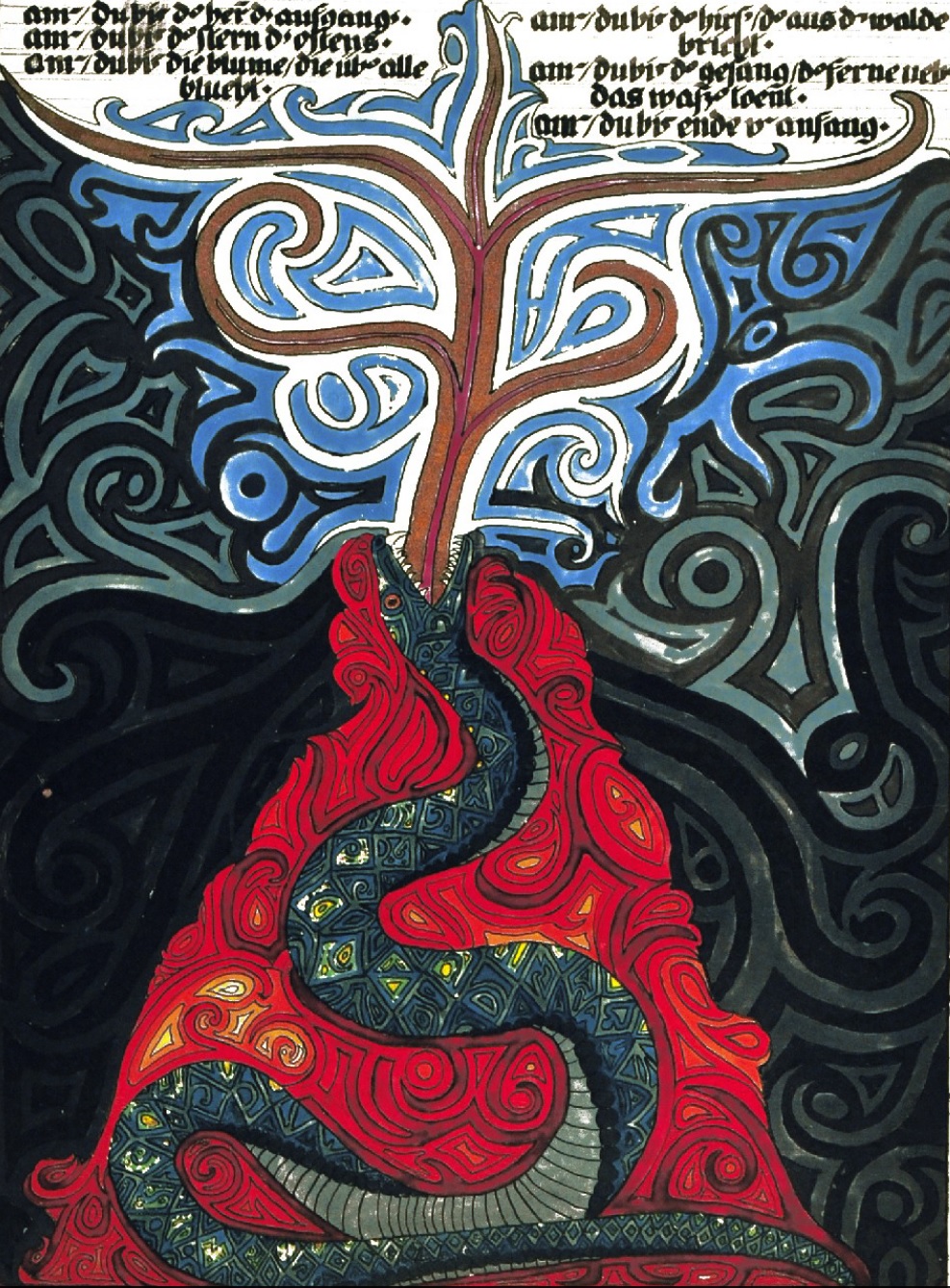 (book footnote) In “Dreams”, Jung noted on January 3, 1917: “In Lib. Nov. snake image III incent” [stimulus to snake image III in ‘Liber Novus’]. This notation appears to refer to this image. Image legend: brahmanaspati.” Julius Eggling notes that “Brihaspati or Brahmanaspati, the lord of prayer or worship, takes the place of Agni, as the representative, of the priestly dignity … Brihaspati is said to have found (avindat) the dawn, the sky and the fire (agni), and to have chased away the darkness with his light (arka, sun), he seems rather to represent the element of light and fire generally.”